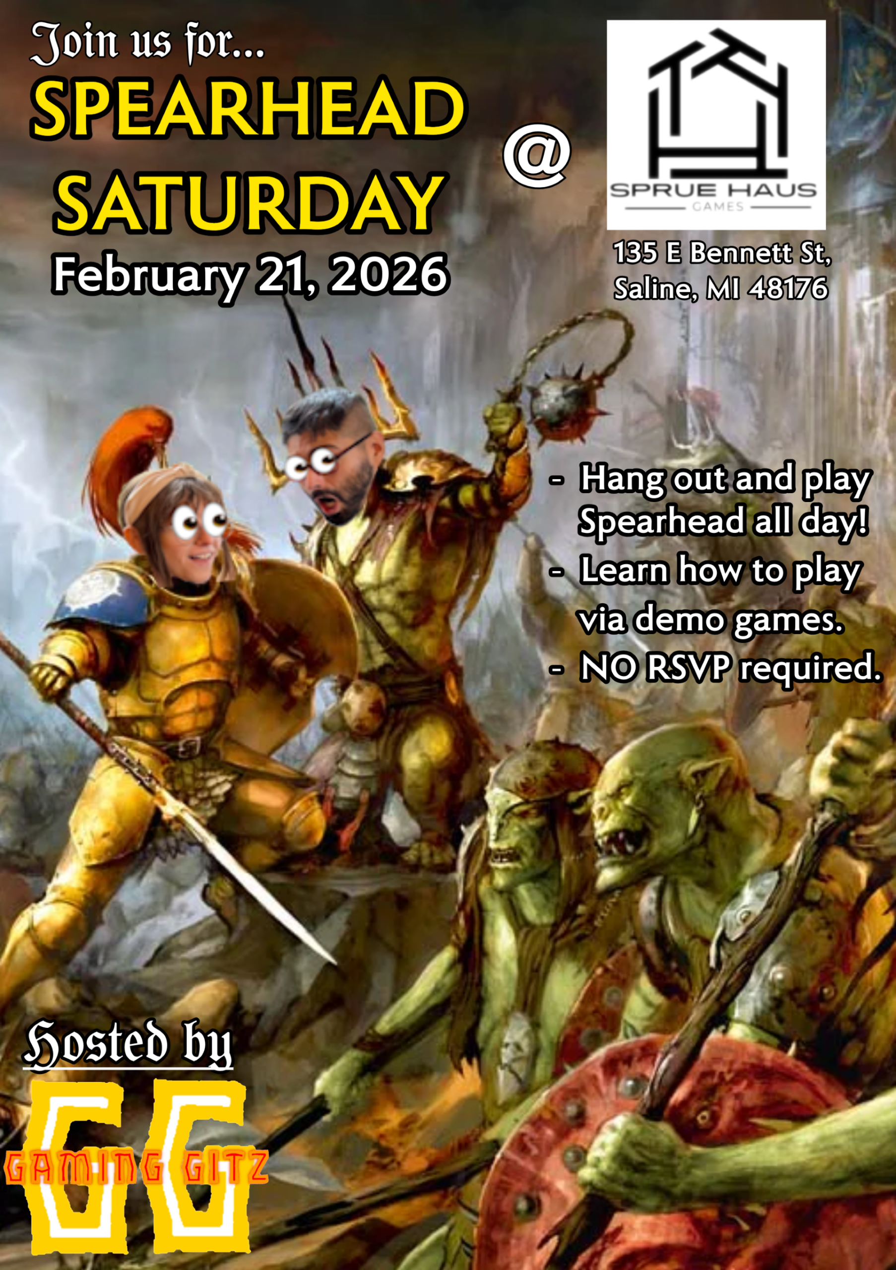Join us noon-6pm on Saturday 2/21 to learn and play Age of Sigmar Spearhead! Gaming Gitz Rafiq and Riley will be hosting, so come on in and roll some dice with us!